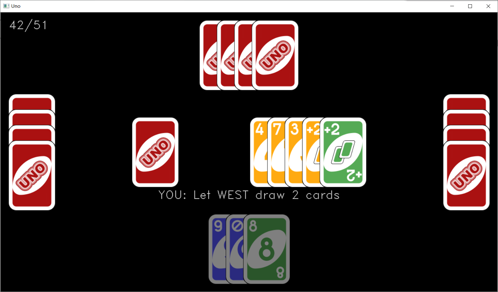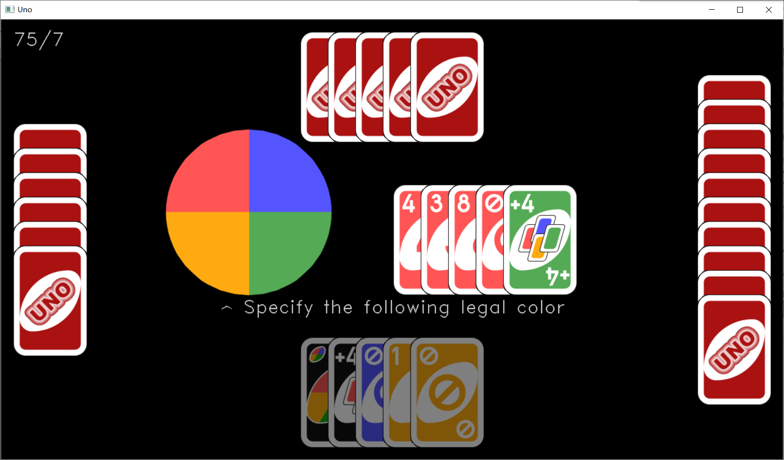 如果是电脑打出了一张黑牌,那么直接由 AI 计算得出要选定的接下来的跟牌颜色就可以了。如果是玩家打出了一张黑牌,那么在打出这张牌之前,还需要插入一个【指定接下来跟牌的颜色】的过程。在 onMouse 函数的 case Player::YOU 分支里,我额外做了一次判断,如果选定的牌是黑牌,那么先将状态码改成 STAT_WILD_COLOR,然后调用 onStatusChanged 函数完成第一次交互。在 onStatusChanged 函数的 case STAT_WILD_COLOR 分支里,我先把牌堆区域的那张牌背图案抹掉,然后画了四个 90° 的扇形。同时 onMouse 的 case STAT_WILD_COLOR 分支里,根据鼠标指针所在位置判断位于哪个扇形内,然后调用 play 函数打出黑牌并指定颜色。(这里做得不够完善,只有鼠标指针落在扇形的内接正方形里才能被识别到)