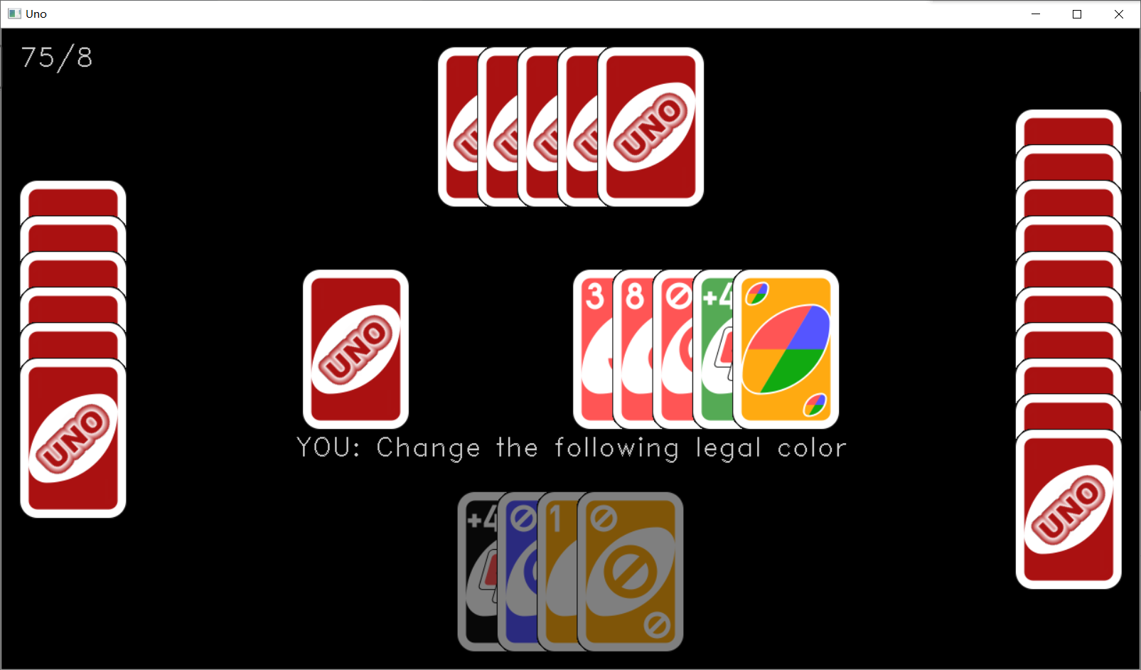 我把除牌背外的每张牌都额外做了一次暗色处理,准备在画面显示中,用暗色牌表示“不可出的牌”,用亮色牌代表“可以出的牌”。另外,带颜色的黑牌也没有做暗色处理。这里带颜色的黑牌只用来指示打出这张牌的玩家指定的接下来的合法颜色是什么,只会出现在“最近打出的牌”里,而不会出现在玩家的手牌里。实际的 108 张牌里并没有真正意义上的“带颜色的黑牌”。
