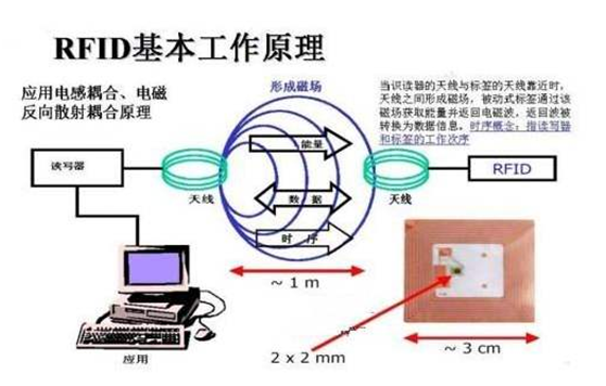 RFID(Radio Frequency Identification)即无线射频识别系统,也称为无线IC标签、电子标签、感应式电子芯片、感应卡、非接触卡等,它是一种透过无线电波来达到非接触的资料存取的技术,可透过无线通讯结合资料存取技术,连结背后的资料库系统,形成一个庞大且串连在一起的系统。一个完整的RFID系统包含读取机、感应器或晶片、天线、软硬件系统等,其基本原理是,当卷标进入磁场区域后,接收的读取器发出信号,凭借感应电流所获得的能量发送出存储在芯片中的产品信息,或者主动发送某一频率的信号,读取器读取信息并译码后,送至中央信息系统进行有关的处理。