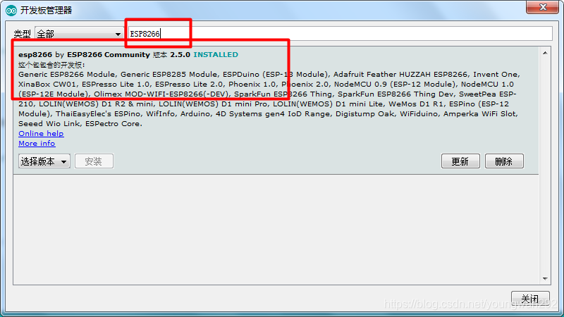 这个网址如果不输入,下一步搜索8266开发板就不能进行,因为8266开发板支持库是在这个网址放着,不填写,就定位到默认支持库去寻找。然而默认支持库网址里面是没有这个的。