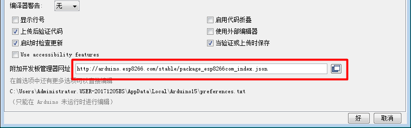在“附加开发板管理器网址”里面输入网址http://arduino.esp8266.com/stable/package_esp8266com_index.json