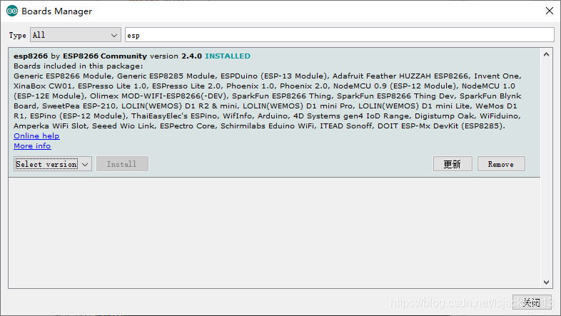 重启以下IDE,这时候就可以在““工具->板:”里看到很多esp8266的版本了。