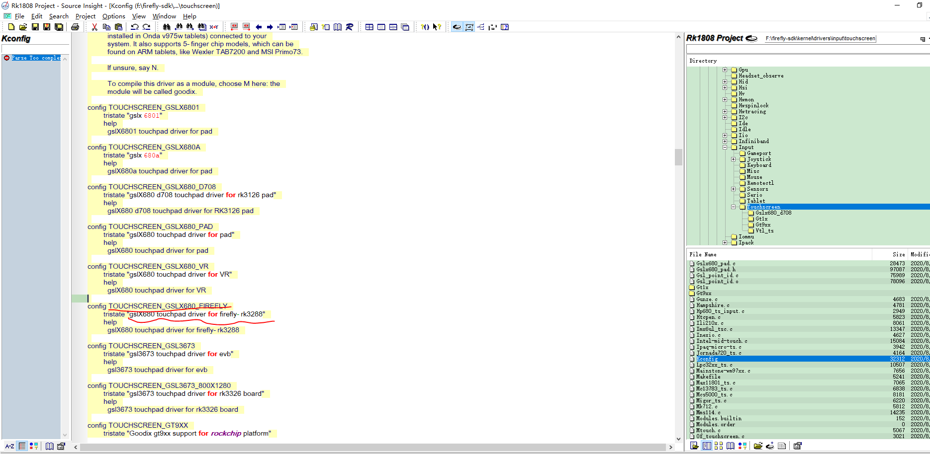 2.查看Kconfig内容,可以看到CONFIG_TOUCHSCREEN_GSLX680_FIREFLY和字符串"gslX680 touchpad driver for firefly-rk3288"绑定,通过选择"gslX680 touchpad driver for firefly-rk3288"来配置CONFIG_TOUCHSCREEN_GSLX680_FIREFLY宏定义