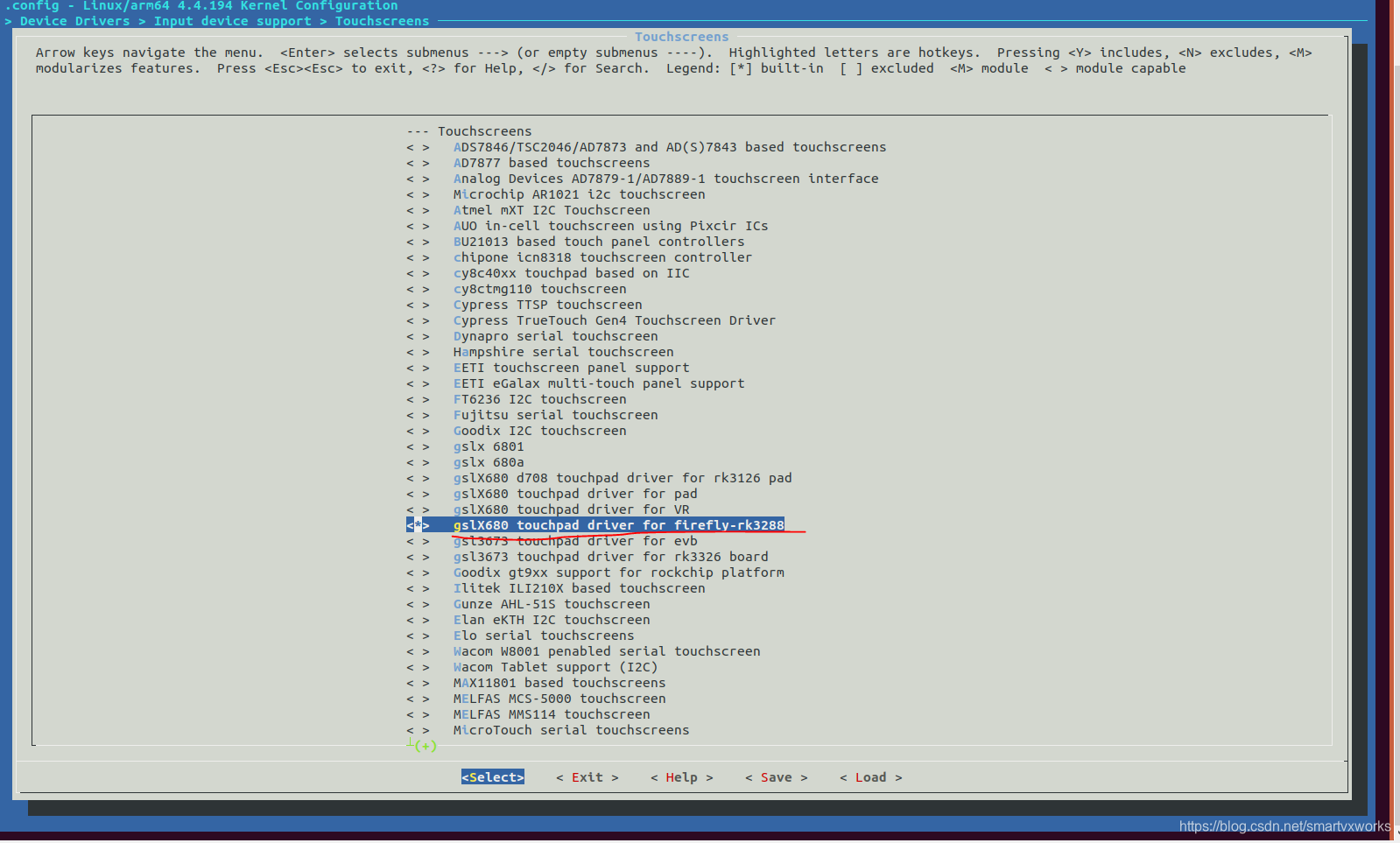 b.可以看到"gslX680 touchpad driver for firefly-rk3288"以动态加载方式已经选择好了,这里选择后,那么宏CONFIG_TOUCHSCREEN_GSLX680_FIREFLY就定义了,此时会生成.config,这里我将其保存为.config,下面就一起看一下.config内容