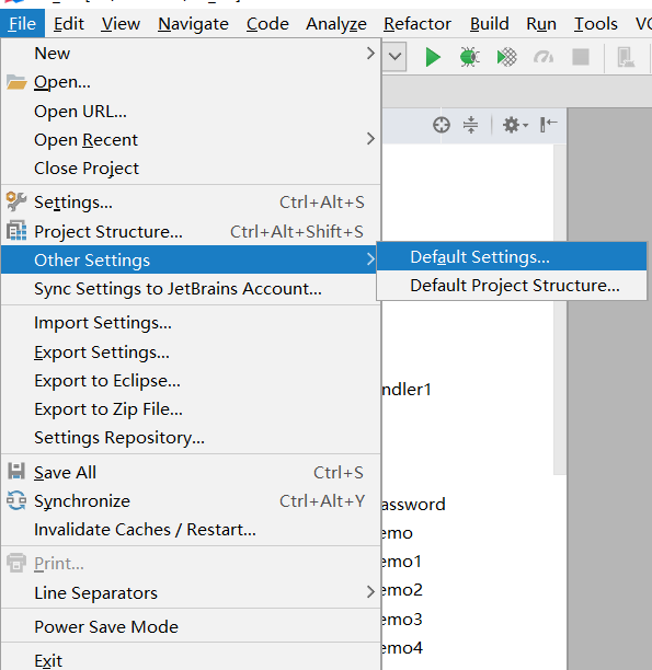 1.首先,打开IDEA,点击File,在下拉菜单中的Other Settings选项中选择Default Settings.