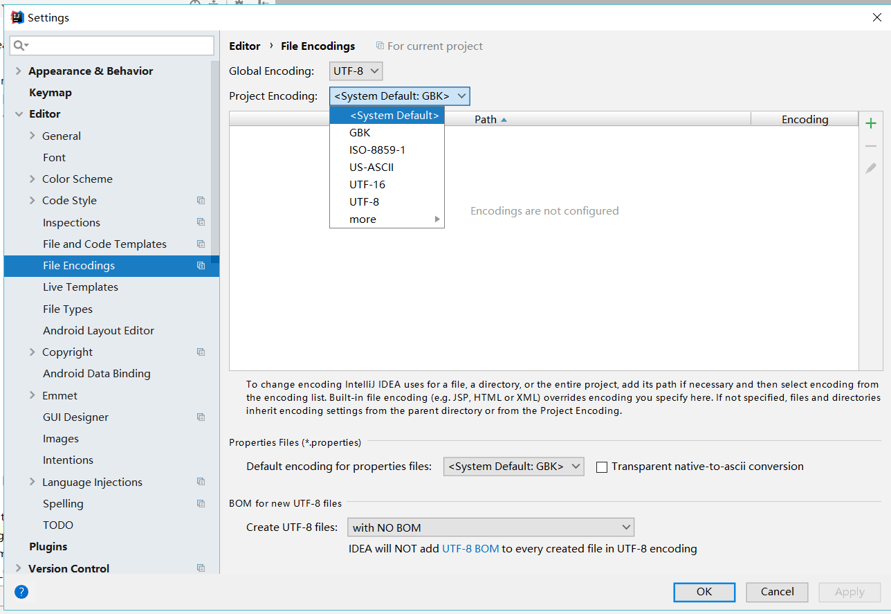 IDEA中默认是GBK编码。但是我们在做项目的时候,有时候需要改变编码类型,此时可以通过Settings-Editor-File Encodings右边的Project Encoding进行选择设置。
