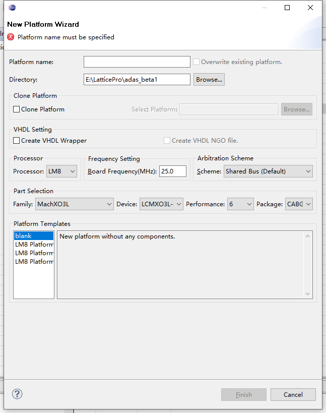 然后点击file->new platform,然后出现如下界面,输入名字即可,下面的型号参数为自己的板子的型号,这里我以我自己举例。
