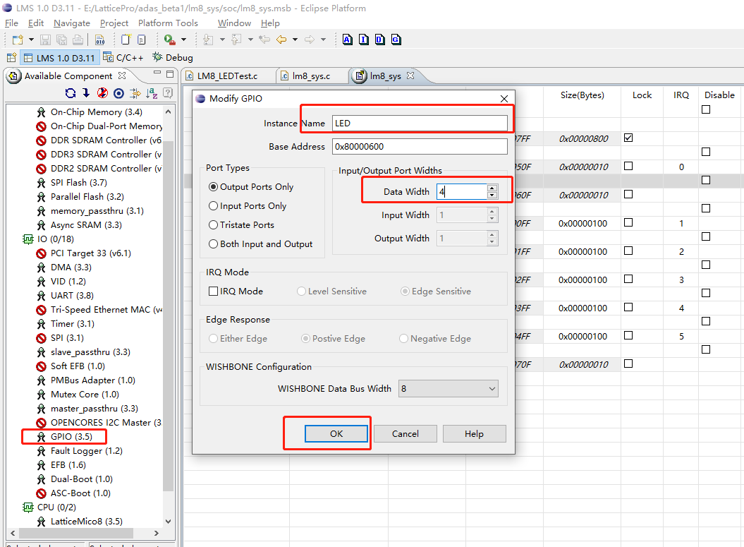 点击gpio按钮,将名字修改成LED,Data Width修改为4,然后点击OK。