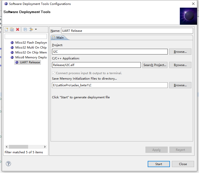 选择好之后然后编译,编译完了还没完,还记得PROM Settings 和Scratchpad Settings那里的参数吗,需要设置那两个参数,点击tool->sortware deployment,点击Mico8,配置对路径,然后start。