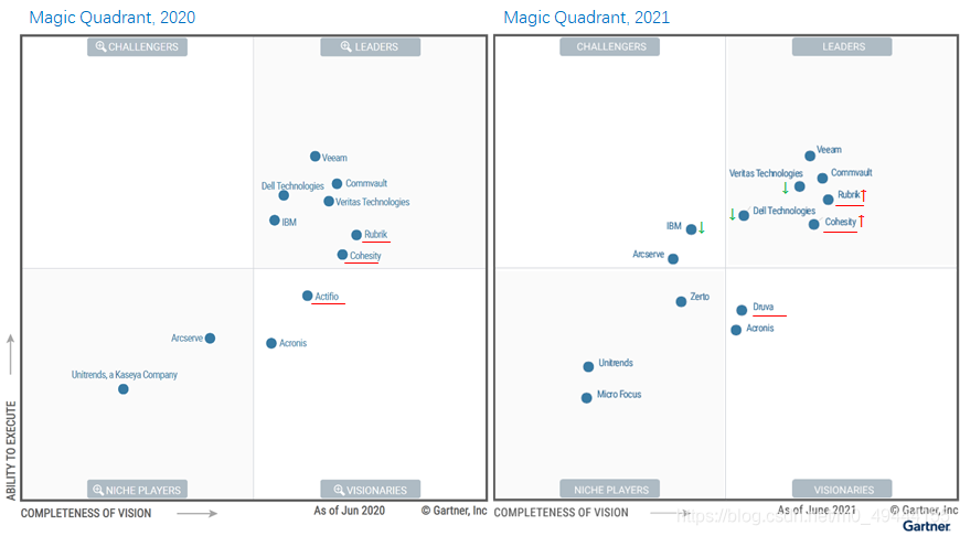 2020年是CDM厂商(Rubrik和Cohesity)首次进入领导者象限的标志性年份。下图把今年与2020年的报告,放在一起对比,就能看出CDM对老的传统备份技术体系的全面冲击,已经开始体现出来了。