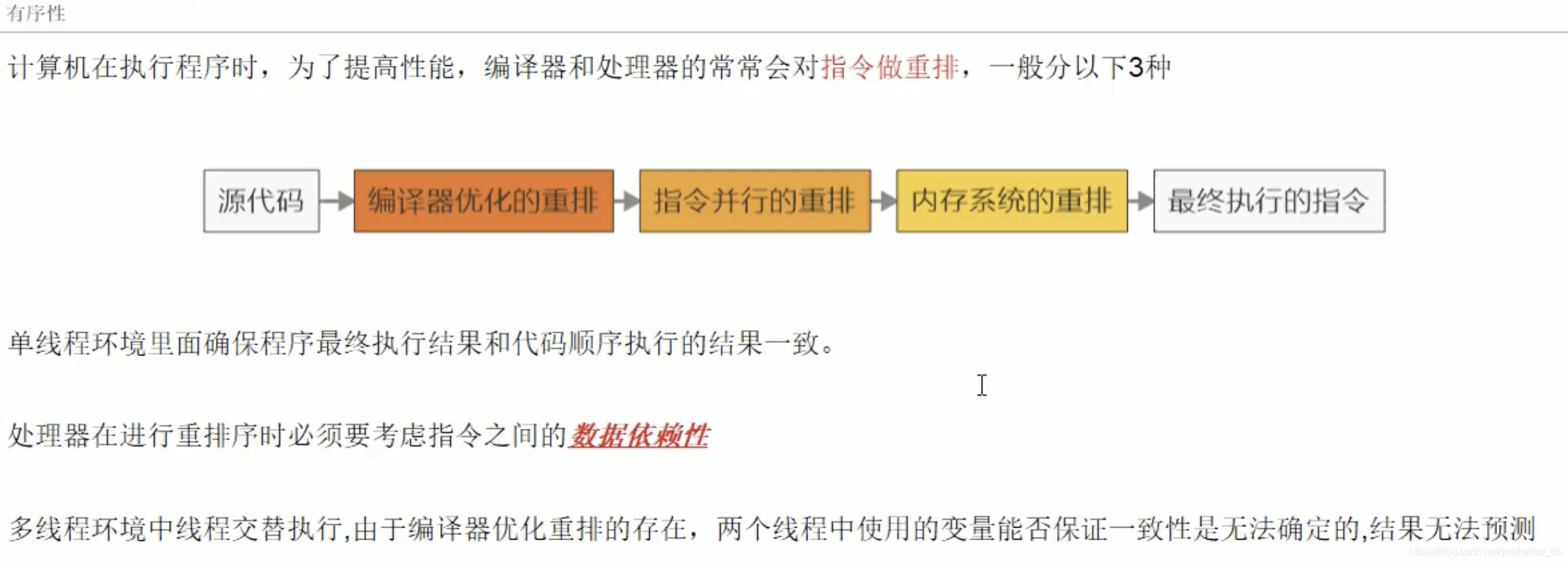 但是指令重排只会保证串行语义的执行的一致性(单线程),但并不会关心多线程间的语义一致性。