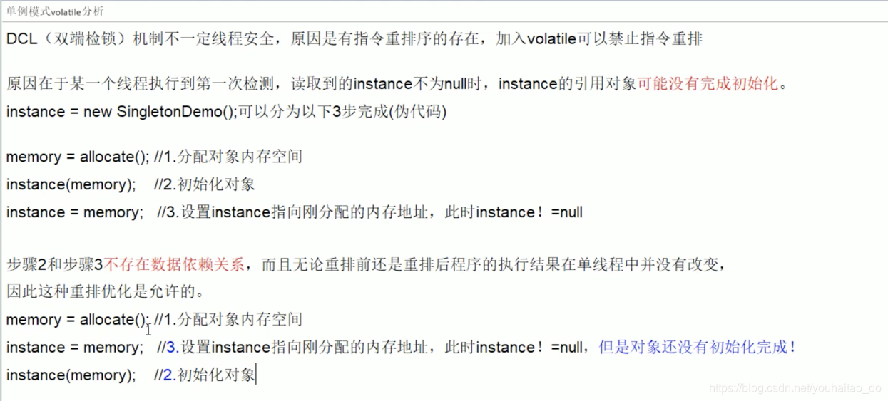 所以当一条线程访问instance不为null时,由于instance实例未必已初始化完成,也就造成了线程安全问题。