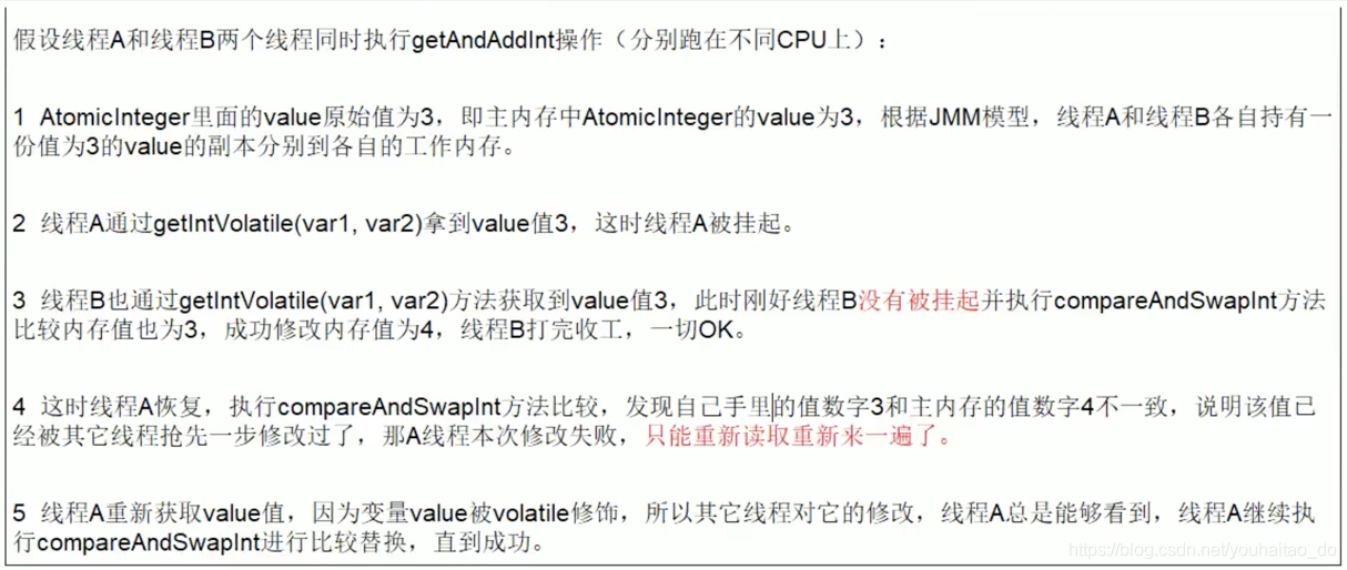 比如说一个线程one从内存位置V中取出A,这时候另一个线程two也从内存中取出A,并且线程two进行了一些操作将值变成了B,然后线程two又将V位置的数据变成A,这时候线程one进行CAS操作发现内存中仍然是A,然后线程one操作成功。