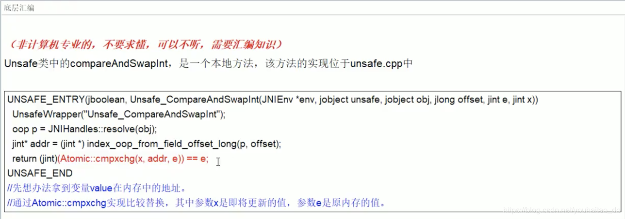 它的功能是判断内存某个位置的值是否为预期值,如果是则更改为新的值,这个过程是原子的。