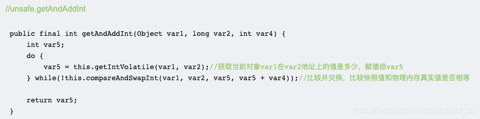 public final int getAndAddInt(Object var1, long var2, int var4) {int var5;do {var5 = this.getIntVolatile(var1, var2);//获取当前对象var1在var2地址上的值是多少,赋值给var5} while(!this.compareAndSwapInt(var1, var2, var5, var5 + var4));//比较并交换,比较快照值和物理内存真实值是否相等return var5; }