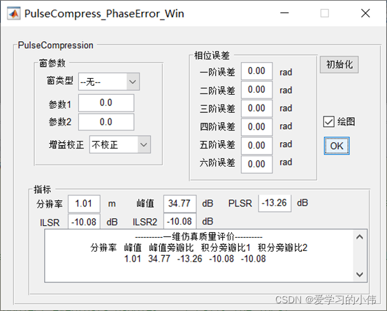 1. 在matlab环境下打开并运行“PulseCompress_PhaseError_Win.m”文件,显示如下界面,点击“初始化”。