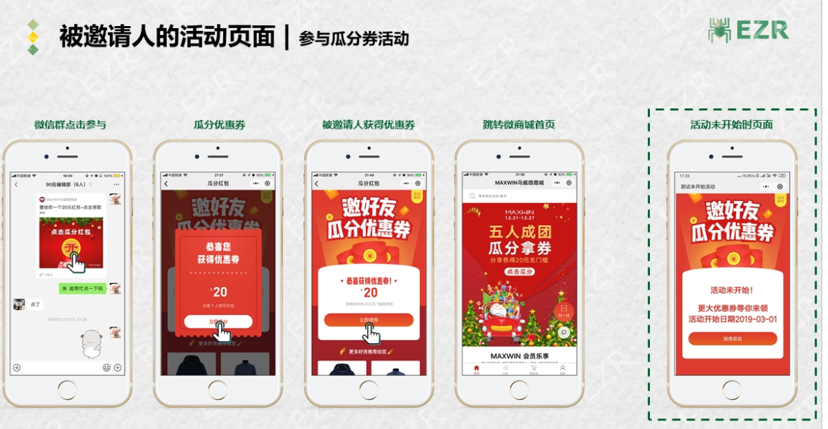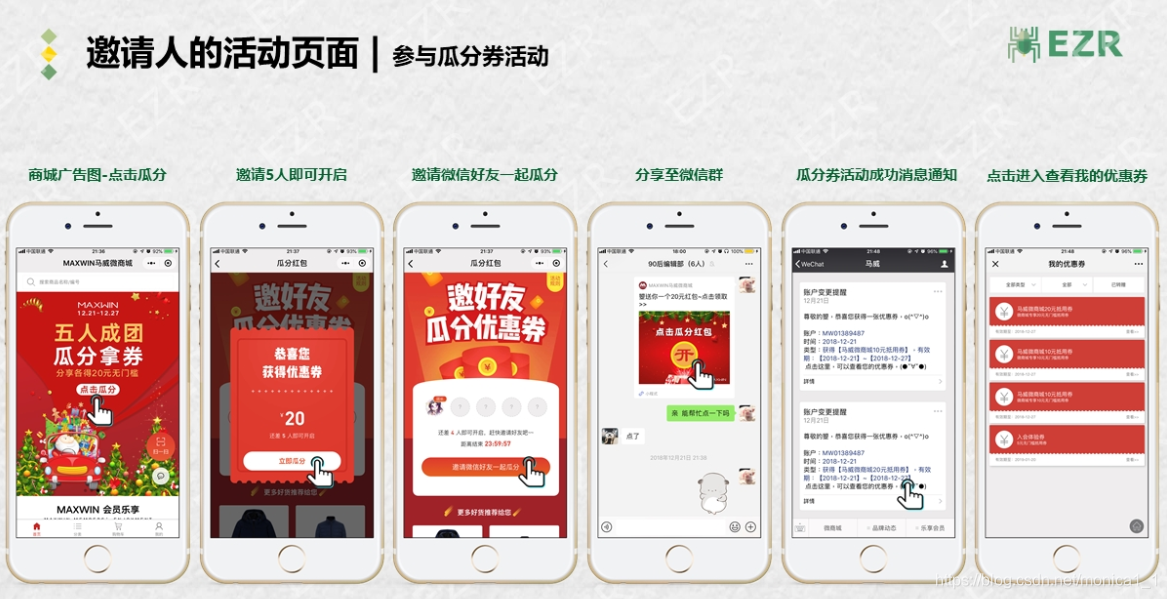 首页广告图——点击瓜分——提示“分享到10个微信群即可领取”——分享后提示“还需分享10-n个微信群即可领取”——分享达到数量后——显示优惠券领取成功