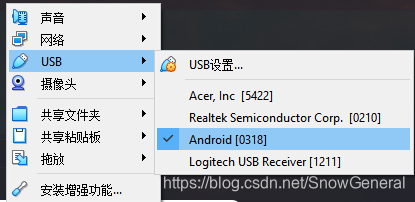 - 在虚拟机菜单栏选择 设备 > USB ,选择需要在虚拟机中看到的设备。