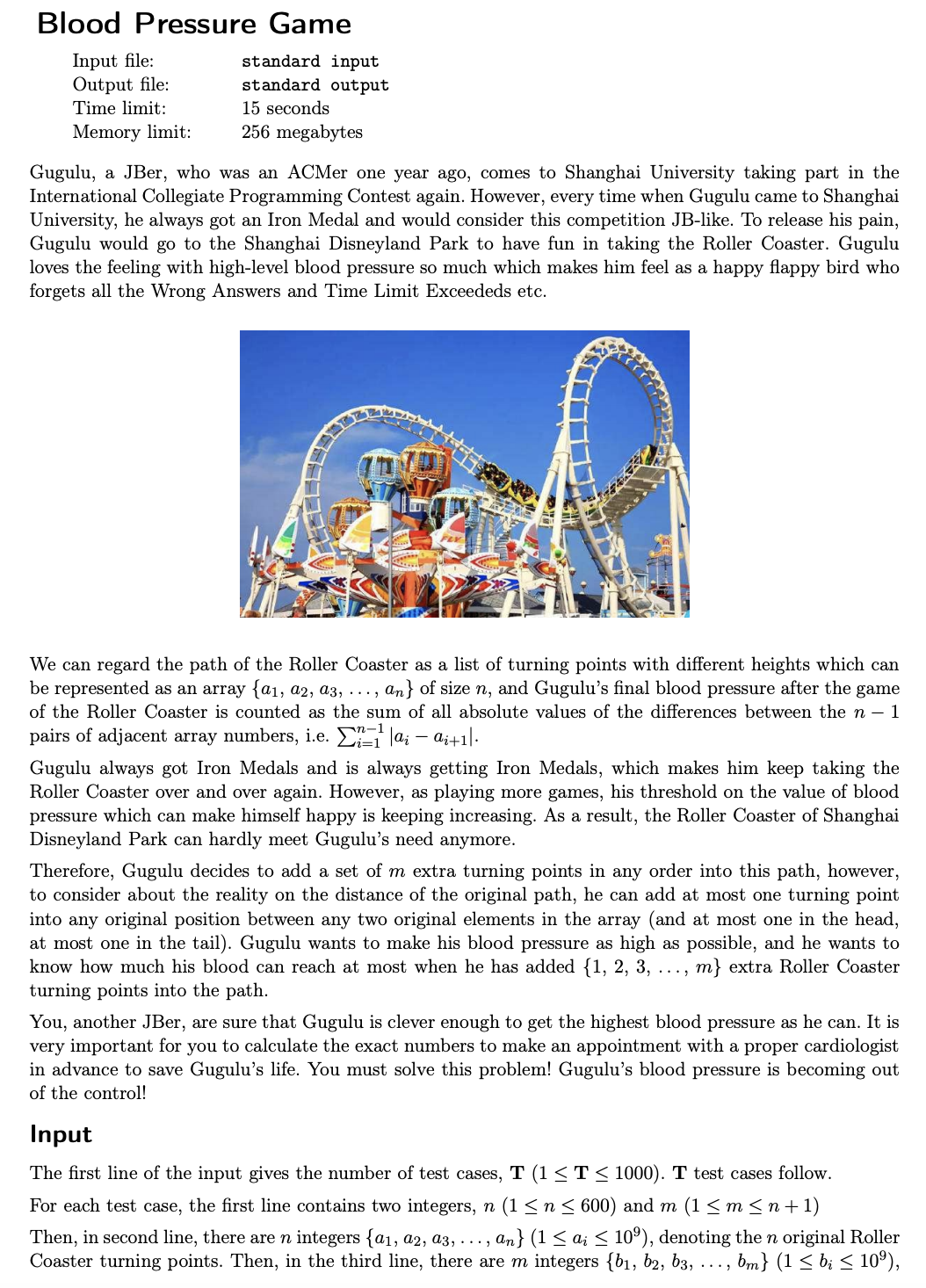 作为前来上海大学参加ICPC比赛的退役ACMer现役JBer,小明每次来上海大学参加比赛,都会打铁。心里就会产生一种"这是什么JB比赛"的念头。为了排解痛苦,他就会去上海的迪士尼坐过山车。他很喜欢这种血压拉满的感觉,让他感觉自己如同变成了一只"快乐"的Flappy Bird,忘记了所有的WA和TLE……