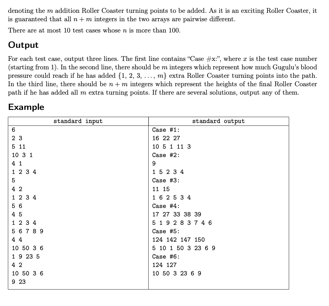 {srand(time(0));freopen("Human Data.in", "w", stdout);casenum = 8; printf("%d\n", casenum);for (casei = 1; casei <= casenum; ++casei) {set<int>sot;n = 600; m = 601;printf("%d %d\n", n, m);int basic = 5000 + rand() % 1000;int dif = rand() % 3 + 2;a[1] = basic; sot.insert(a[1]);a[2] = basic + 1; sot.insert(a[2]);for(int i = 3; i <= n; ++i){if (i & 1)a[i] = a[i - 2] - dif;else a[i] = a[i - 2] + dif;sot.insert(a[i]);}for(int i = 1; i <= n; ++i) {printf("%d ", a[i]);}puts("");for(int i = 1; i <= m; ++i) {do{b[i] = rand() % (basic + dif * n) + 1;}while(sot.count(b[i]));sot.insert(b[i]);printf("%d ", b[i]);}puts("");}