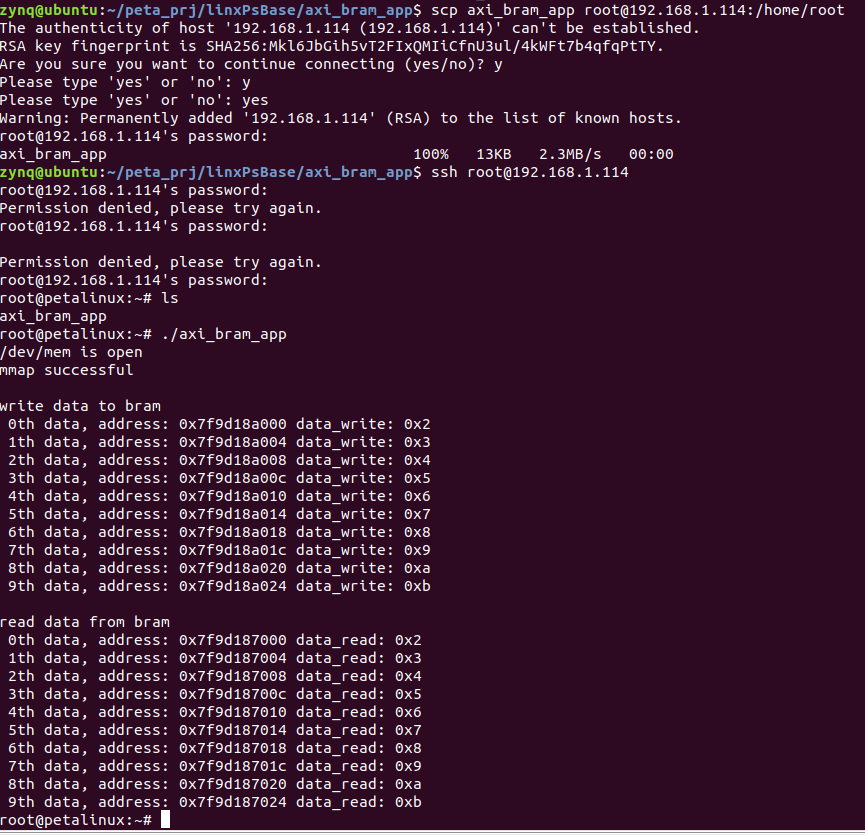 {unsigned int *map_base0;unsigned int *map_base1;int fd = open("/dev/mem", O_RDWR | O_SYNC);if (fd < 0) {printf("can not open /dev/mem \n");return (-1);} printf("/dev/mem is open \n");map_base0 = mmap(NULL, DATA_LEN * 4, PROT_READ | PROT_WRITE, MAP_SHARED, fd, BRAM_CTRL_0);map_base1 = mmap(NULL, DATA_LEN * 4, PROT_READ | PROT_WRITE, MAP_SHARED, fd, BRAM_CTRL_1);if (map_base0 == 0 || map_base1 == 0 ) { printf("NULL pointer\n");} else {printf("mmap successful\n");} unsigned long addr;unsigned int content;int i = 0;printf("\nwrite data to bram\n");for (i = 0; i < DATA_LEN; i++) {addr = (unsigned long)(map_base0 + i); content = i + 2;map_base0[i] = content;printf("%2dth data, address: 0x%lx data_write: 0x%x\t\t\n", i, addr, content);} printf("\nread data from bram\n");for (i = 0; i< DATA_LEN; i++) {addr = (unsigned long)(map_base1 + i); content = map_base1[i];printf("%2dth data, address: 0x%lx data_read: 0x%x\t\t\n", i, addr, content);} close(fd);munmap(map_base0, DATA_LEN);munmap(map_base1, DATA_LEN);return 0;