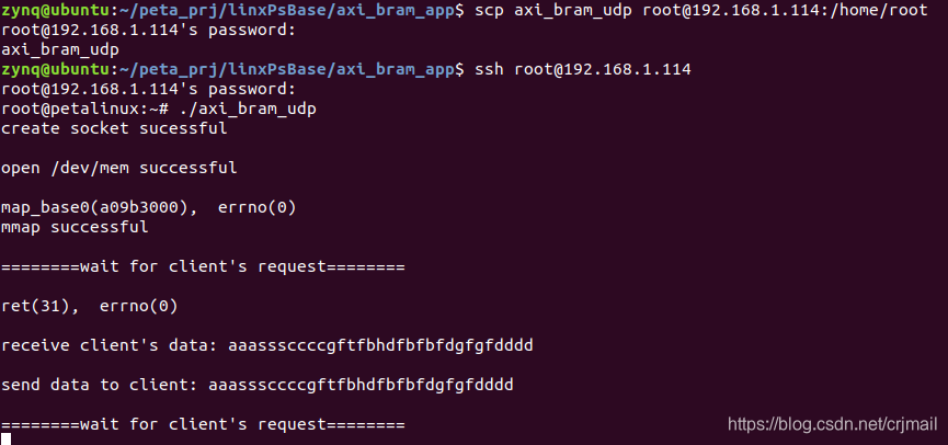 2、也可以将BRAM与socket进行联合使用,将PC端的数据发到PS端,PS端放在PL端,PL端再发给PS端,PS端发回PC端。