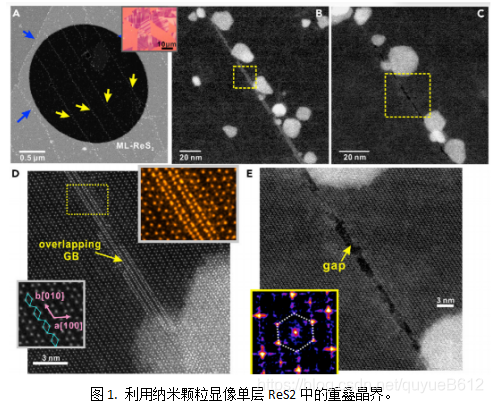 三斜晶系的单层ReS2中彼此平行的晶粒因存在水平位移而无法形成原子级成键的晶界,只能产生重叠晶界;表征了具有不同宽度和层间堆垛模式的重叠晶界,并发现其具有显著的优势取向性。此外,还观测到由扭角小于1°的准平行晶粒形成的重叠晶界,数学证明其为非共度结构,不具有平移对称性,继魔角石墨烯和双层碳管的超润滑研究之后,该发现有望激发对非公度小角重叠晶界在电学和结构超润滑领域的性质探索。