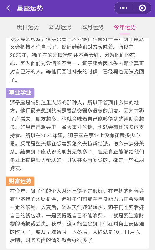 其次,数据不是我凭空捏造的哦,来自某权威的开放平台,每天会定时更新,而且我觉得有些结果还是很准的。我这岁数当然不会再无耻地看那些爱情运势,当看到自己狮子座今年事业和财富运势时,心里是老泪纵横的,理解万岁啊!