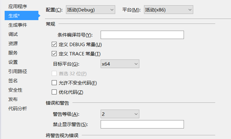 “解决方案资源管理器”中找到自己的项目,右键,选择“属性”,打开后点击“生成”,在这里把“目标平台”改为“x86”,如下图