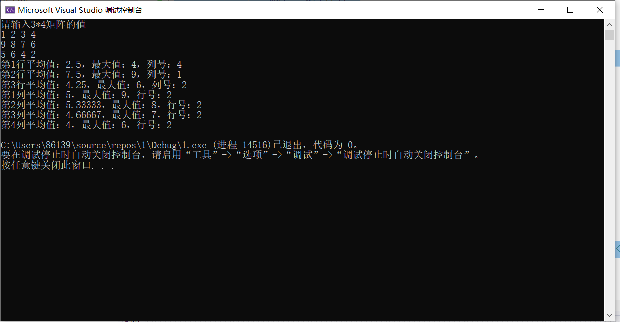 {int a[3][4], i, j;cout << "请输入3*4矩阵的值" << endl;for (i = 0; i < 3; i++)for (j = 0; j < 4; j++)cin >> a[i][j];for (i = 0;i < 3;i++){float b = 0,avg=0;int max = 0, i_max = 1;//我第一次类比max=0,设置的i_max也等于0,那么如果最大数在第一个位置的话,输出的就是列号为0,因此i_max=1更合适for (j = 0; j < 4; j++){b += a[i][j];avg = b / 4;if (a[i][j] > max){max = a[i][j];i_max = j + 1;}}cout << "第" << i + 1 << "行平均值:" << avg << ",最大值:" << max << ",列号:" << i_max << endl;}return 0;