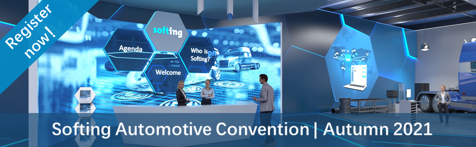 We are pleased to invite you to the next virtual "Softing Automotive Convention" on October 20 and 21, 2021. In our virtual showroom, you will have the opportunity to experience our software solutions and exhibits easily in your office or from home. In addition to the discovery tour through our virtual exhibition, you can expect various live demos and presentations. For example, the experts will demonstrate the quick and easy creation of aftersales tester interfaces, the possibilities of parallel remote access to different test vehicles as well as a solution for self-sufficient flash programming consisting of a vehicle interface, runtime system and corresponding data supply.