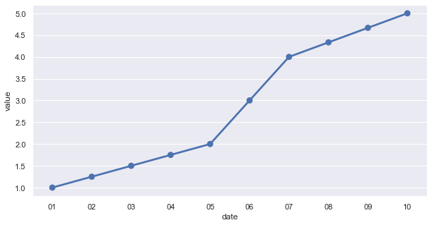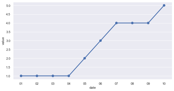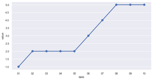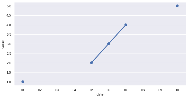 出于演示的目的,我模拟了一些每天的时间序列数据(总共10天的范围),并且设置了一些空白间隙。初始数据如下: