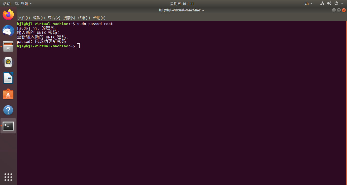 该命令是ubuntu首次为root账户设置密码,先输入当前账户的密码,再创建root账户的密码,并确认。(补充:root账户和登陆ubuntu开机时的账号不一样。Ubuntu装好后只有一个用户,这个用户是有管理员权限的普通用户,不能访问根目录,如果ubuntu访问根目录,可以把自己整个删除,所以需要一个可以访问根目录的超级管理员账号,这就是root账号,所以root账号需要另外创建。)