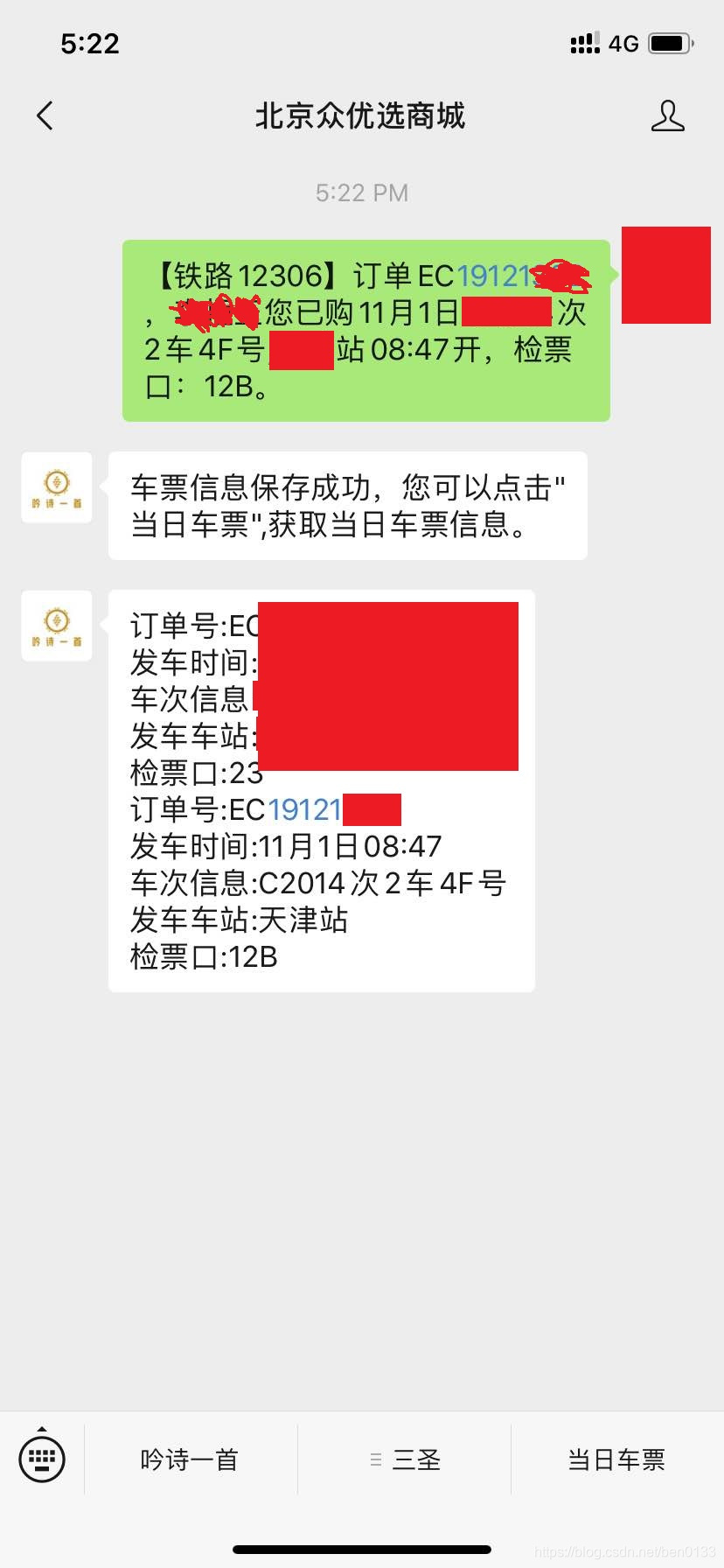 2、在乘车当天点击公众号菜单栏的"当日车票",就会收到当天的车票信息了,在也不怕找不到座位啦。