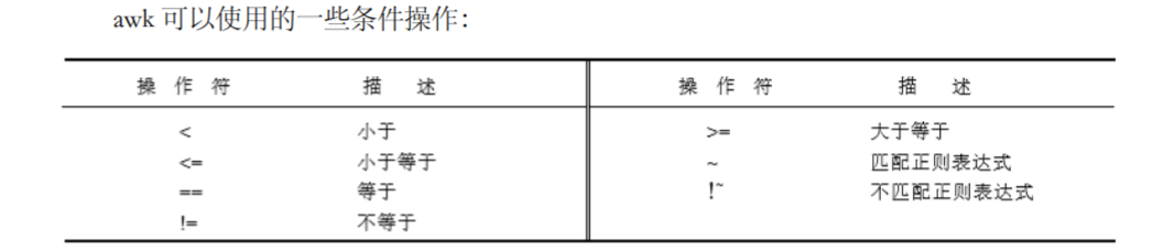 - 在awk中也可以指定操作的条件,例如在/etc/passwd文件中每一行是一个用户的信息