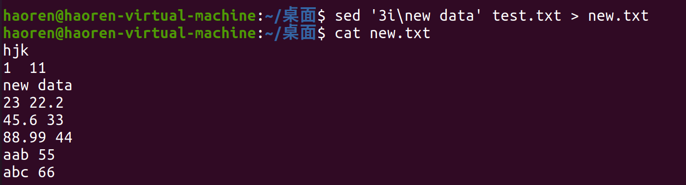 使用sed命令向文件第三行插入一个新数据 " new data ",并保存到文件new.txt中: