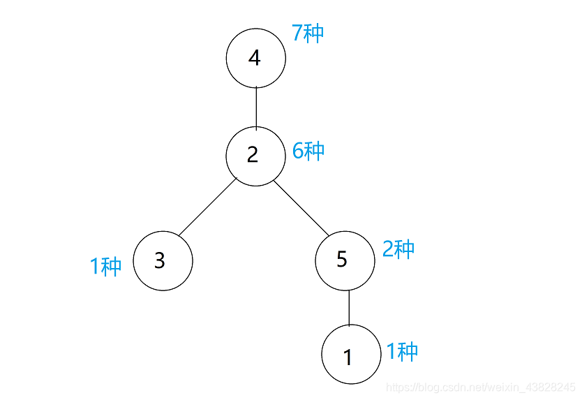 思路:先考虑求第一个答案,定义sum[i] 表示选择 i 节点及其子树可以有多少种类。叶子节点sum[]=1, 对于非叶子节点sum[i] = 子树的sum[]+1 的乘积。比如2号节点有两个儿子,一个儿子有1种,一个儿子有2种,sum[2]的定义是选择当前节点2,左儿子3我可以选也可以不选算2种,右儿子5可以选算2种不选算1种,一共3种情况,所以sum[2] = 2*3=6;
