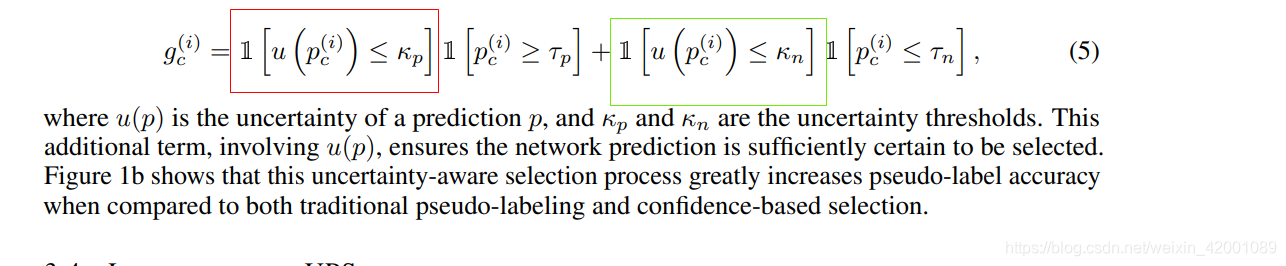 这里的u就是计算不确定性,kp和kn是正负样本不确定性的门限,直观理解就是当低于一定门限时(说明伪标签可靠),我们才用即红框和绿框才为1