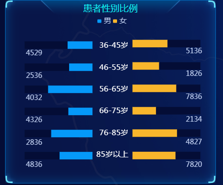 console.log(req.data[0].patientCount);var data = {"_data": [{"_name": "85岁以上","_left": req.data[0].patientCount,"_right": req.data[1].patientCount},{"_name": "76-85岁","_left": req.data[2].patientCount,"_right": req.data[3].patientCount},{"_name": "66-75岁","_left": req.data[4].patientCount,"_right": req.data[5].patientCount},{"_name": "56-65岁","_left": req.data[6].patientCount,"_right": req.data[7].patientCount},{"_name": "46-55岁","_left": req.data[8].patientCount,"_right": req.data[9].patientCount},{"_name": "36-45岁","_left": req.data[10].patientCount,"_right": req.data[11].patientCount}]}var zongjine = [0];var myData = [];var myData_l = [];var myData_r = [];var garybar = [];var data_l = [];var data_r = [];function dataConvert(data) {for (var i = 0; i < data['_data'].length; i++) {myData.push(data['_data'][i]['_name']);var l = parseFloat(data['_data'][i]['_left']);var r = parseFloat(data['_data'][i]['_right']);myData_l.push(data['_data'][i]['_left']);myData_r.push(data['_data'][i]['_right']);garybar.push(1);var l2 = l / (l + r);var r2 = r / (l + r);data_l.push(l2);data_r.push(r2);}}dataConvert(data);var myChart = echarts.init(document.getElementById('xbbl'));myChart.setOption({legend: {data: ['男', '女'],itemWidth: 8,itemHeight: 7,textStyle: {color: 'rgb(189,204,237)',fontSize:'80%'},top: 2这篇关于echarts画交错柱状图的文章就介绍到这儿,希望我们推荐的文章对编程师们有所帮助!
