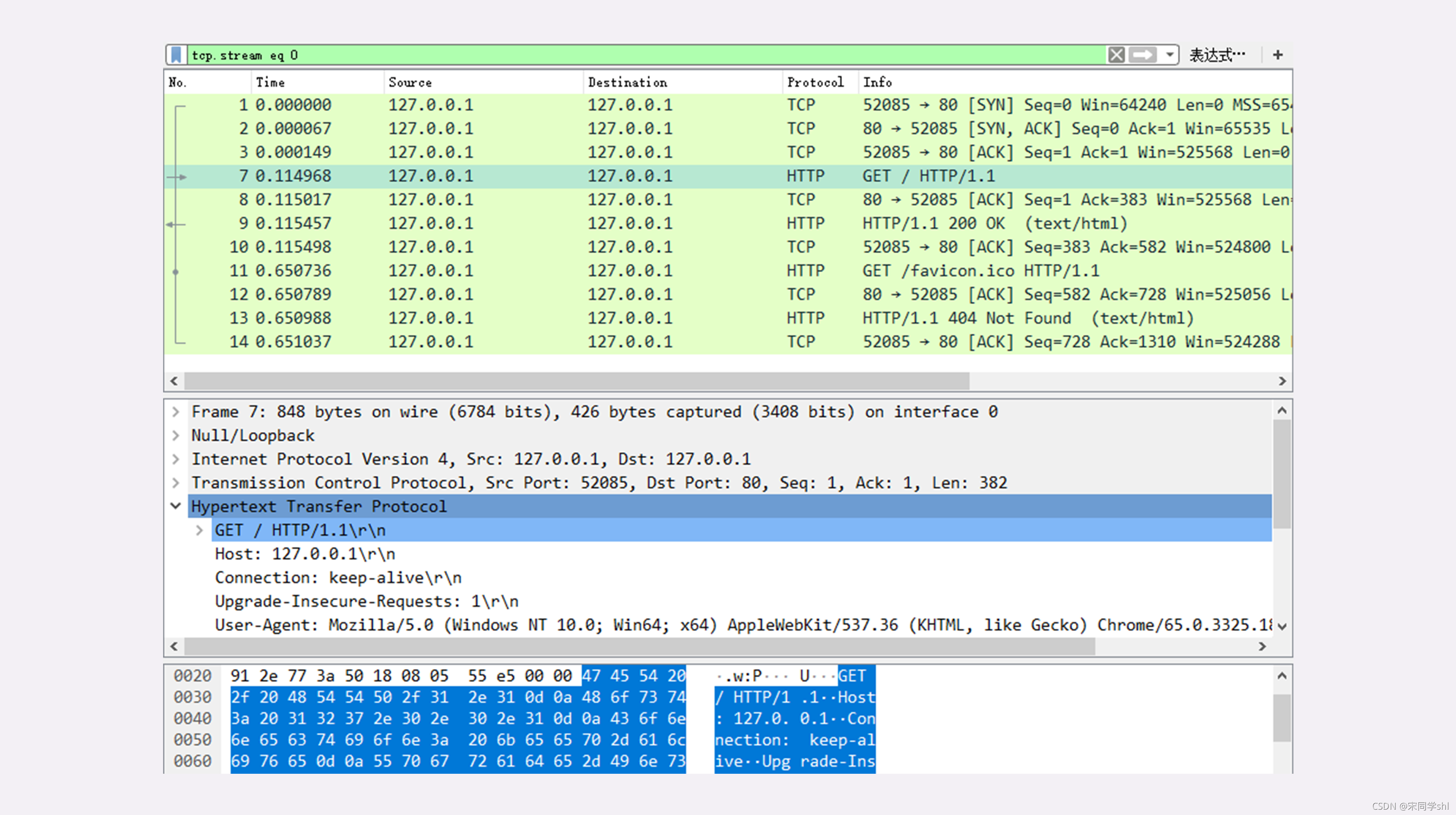 对应到 Wireshark 里,就是最开始的三个抓包,浏览器使用的端口是 52085,服务器使用的端口是 80,经过 SYN、SYN/ACK、ACK 的三个包之后,浏览器与服务器的 TCP 连接就建立起来了。
