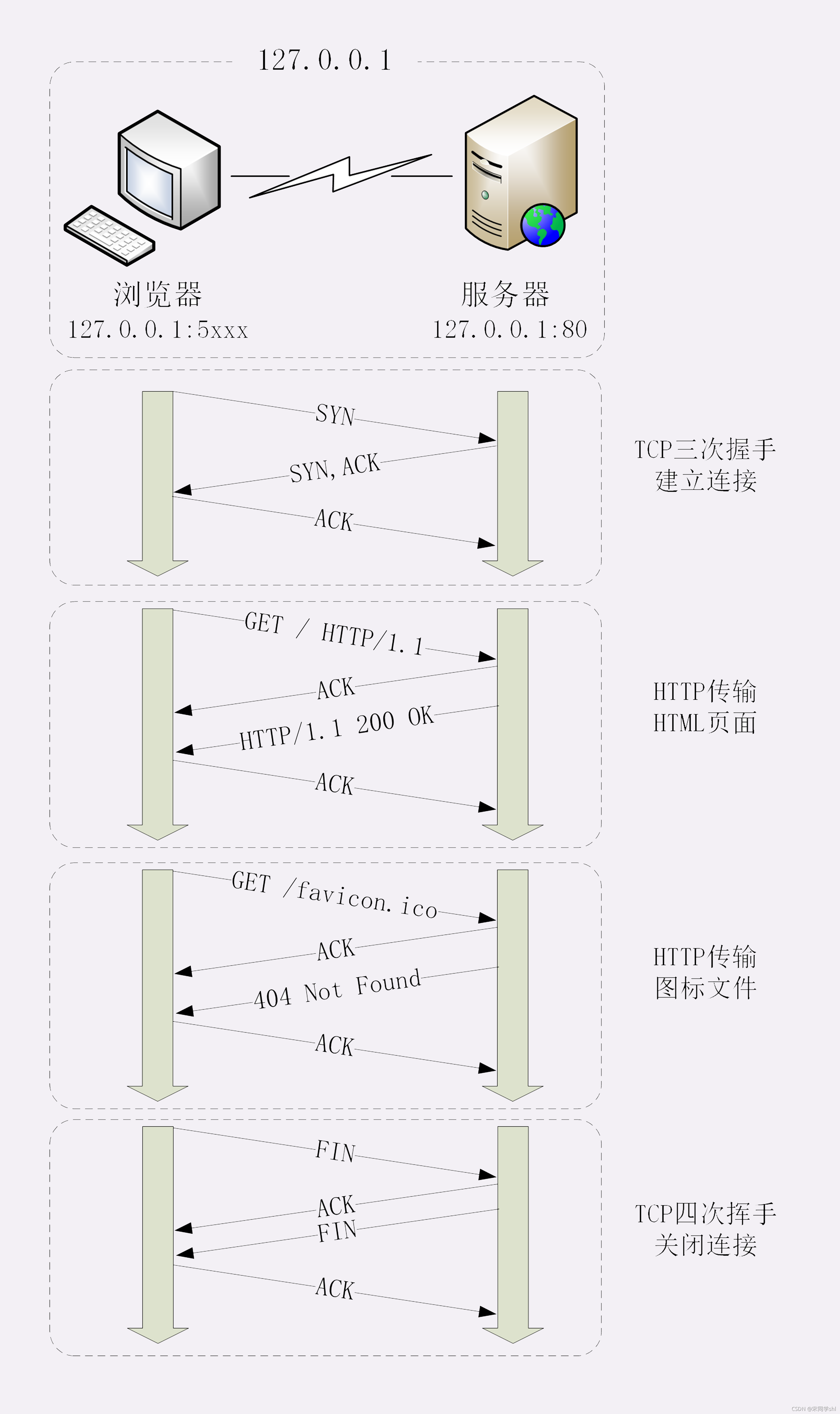 因为我们在地址栏里直接输入了 IP 地址“127.0.0.1”,而 Web 服务器的默认端口是 80,所以浏览器就要依照 TCP 协议的规范,使用“三次握手”建立与 Web 服务器的连接。
