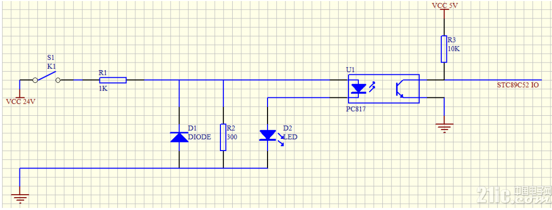 因为LED和光耦发光管的反向击穿电压都很低,一般在5V以下,串联也才10V,而这里的正常输入电压是24V,D1的作用是当反接或出现负干扰脉冲时,钳位住发光耦发光管和LED的反向电压,不致损坏。