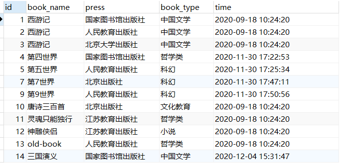 INSERT INTO `book` VALUES (2, '西游记', '人民教育出版社', '中国文学', '2020-09-18 10:24:20');