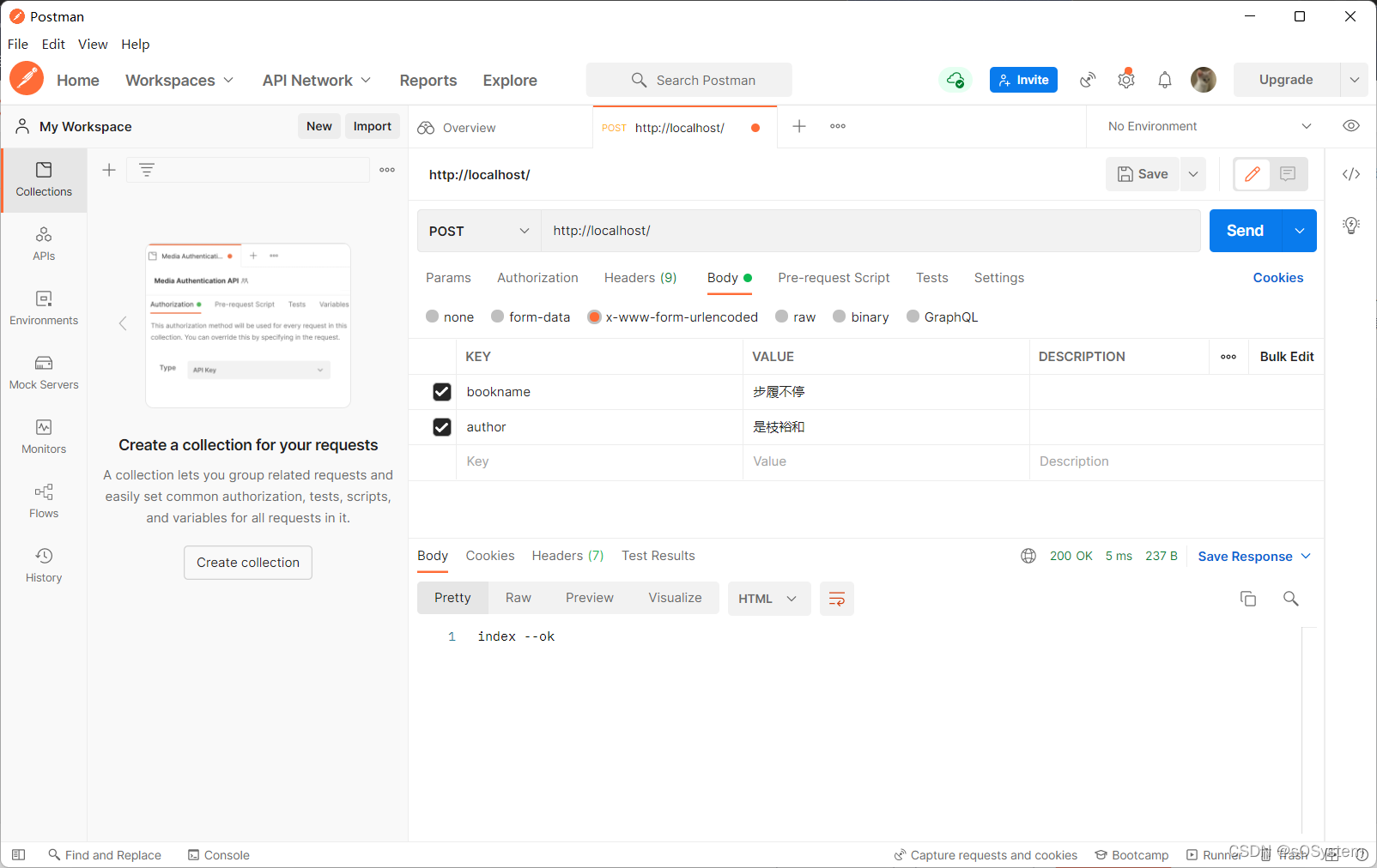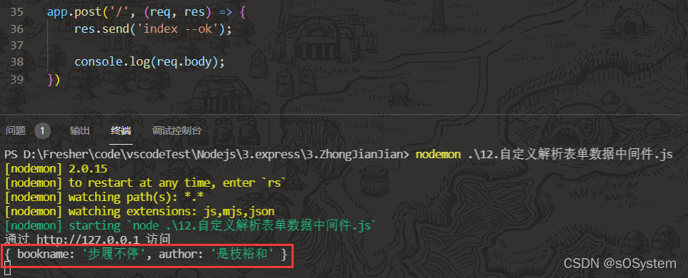 app.use((req, res, next) => {let str = '';req.on('data', chunk => {str += chunk;})req.on('end', () => {// 利用 URLSearchParams 解析 x-www-form-urlencoded 数据const params = new URLSearchParams(str); // params = { 'bookname' => '步履不停', 'author' => '是枝裕和' }// 进一步转换成对象类型数let body = {};params.forEach((value, key) => {body[key] = value;})// 传给请求体 req 下的 body 属性req.body = body;next();})