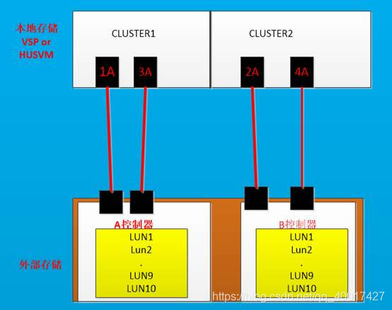| 说明: | l 本地存储VSP/HUSVM 4个FC端口直连或通过交换机连接到外部主机的4个FC端口 l 外部存储A控制器ownership 10个LUN: lun1….lun10 l 外部存储B控制器 ownership 10个LUN: lun1…lun10 创建几个path group的依据是: port数量/外部存储控制器数/LUN数量, 目的确保每个port都有数据流,另外某一个path group的 port使用优先级别最高; |