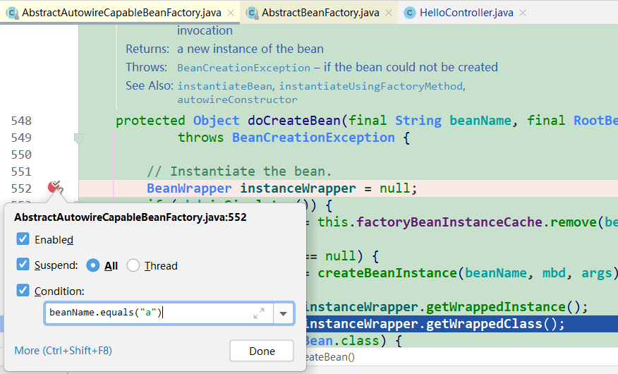 打条件断点(DefaultListableBeanFactory#doCreateBean(beanName, mbdToUse, args)