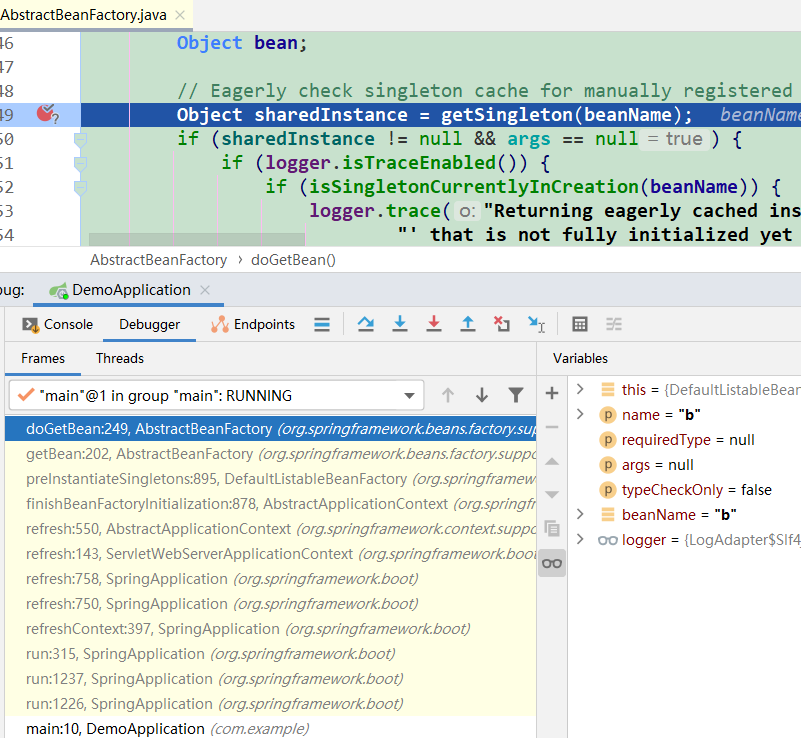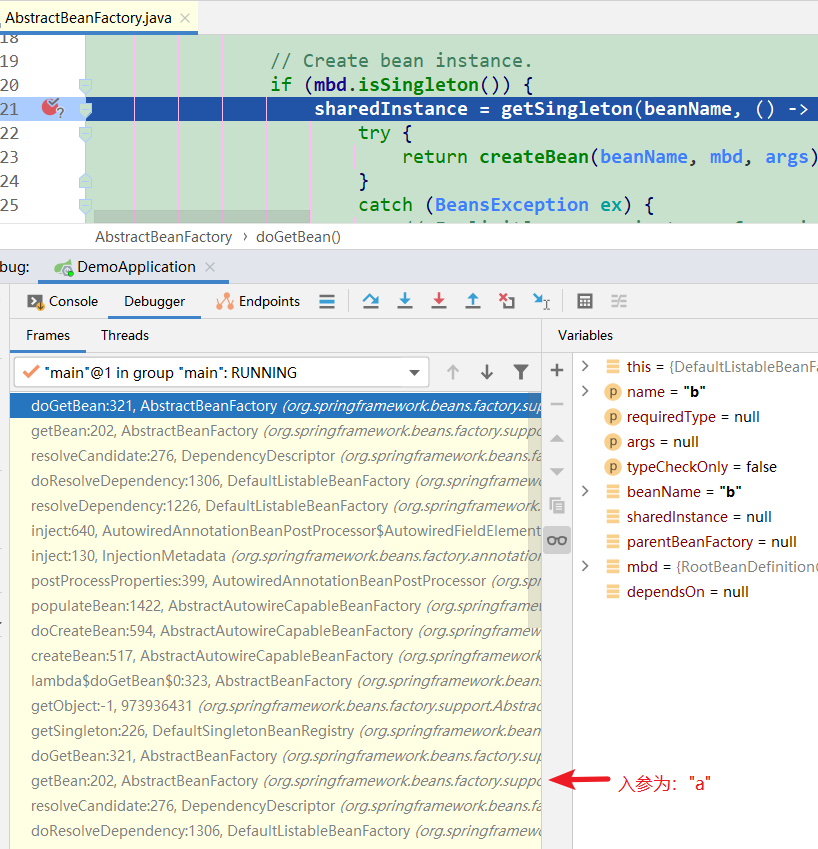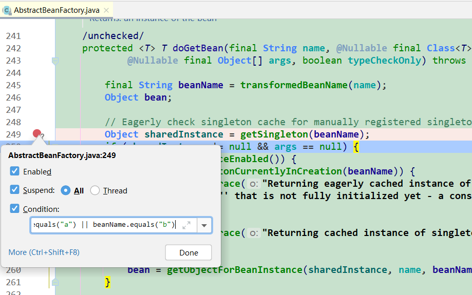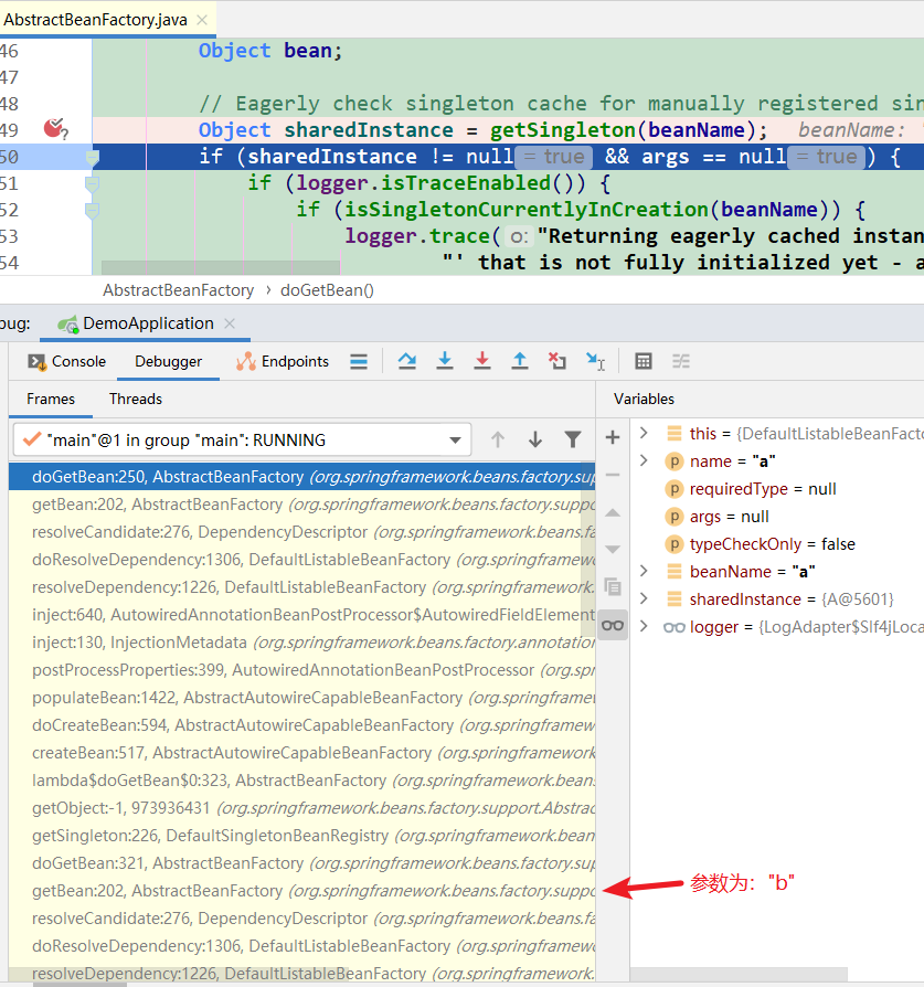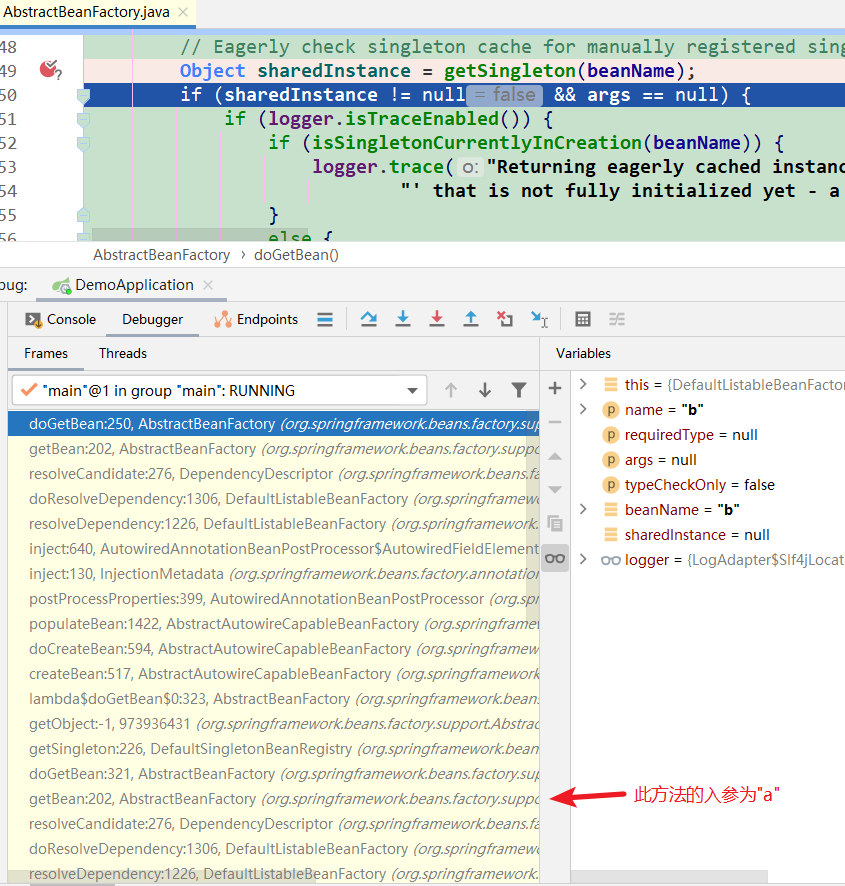 在AbstractBeanFactory#doGetBean()上打两个条件断点:beanName.equals("a") || beanName.equals("b")