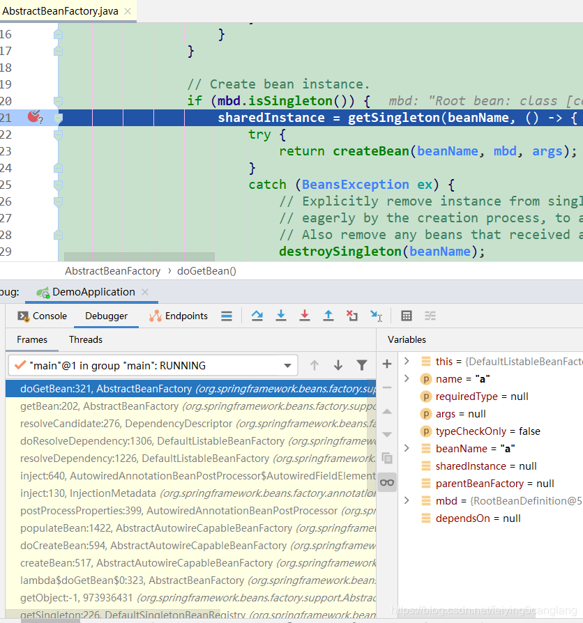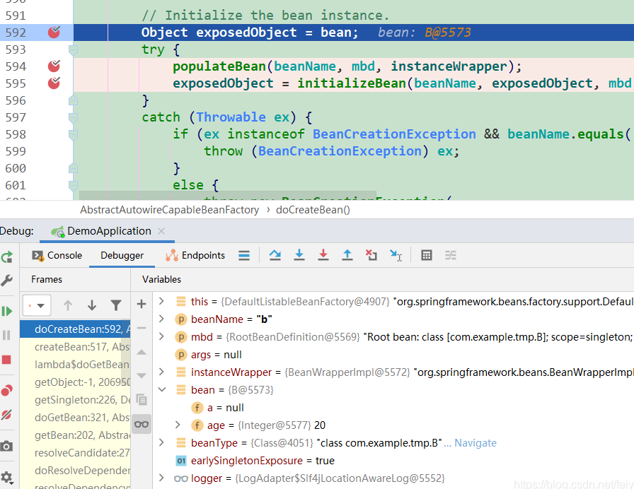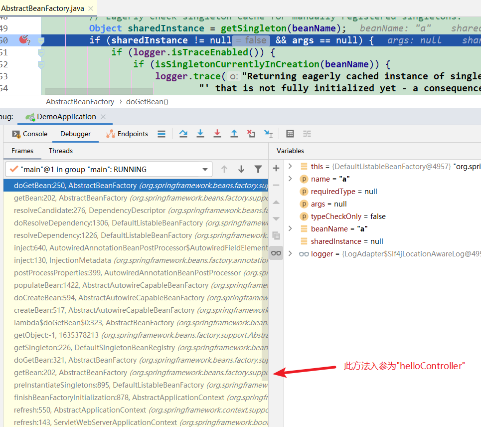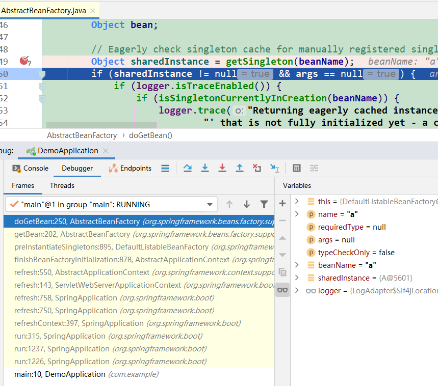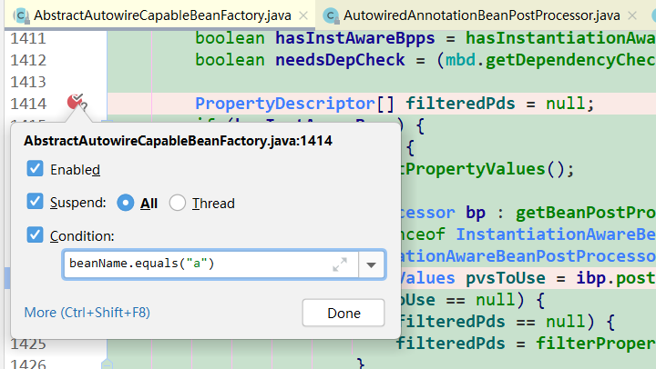 在AbstractBeanFactory#doGetBean()上打两个条件断点:beanName.equals("a") || beanName.equals("b")