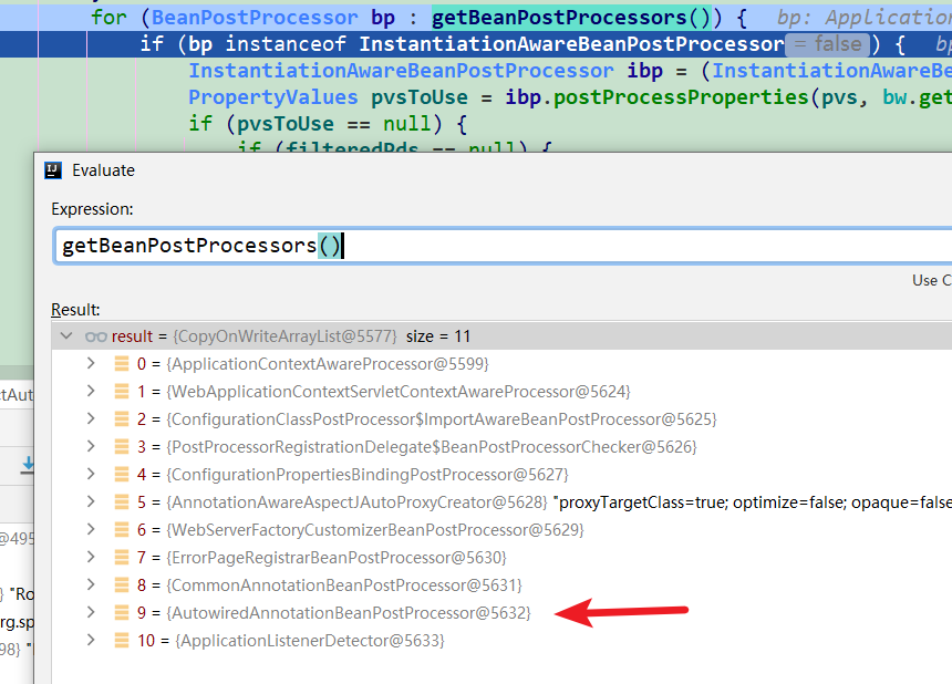 getBeanPostProcessors() // 其中有:AutowiredAnnotationBeanPostProcessor (图1)