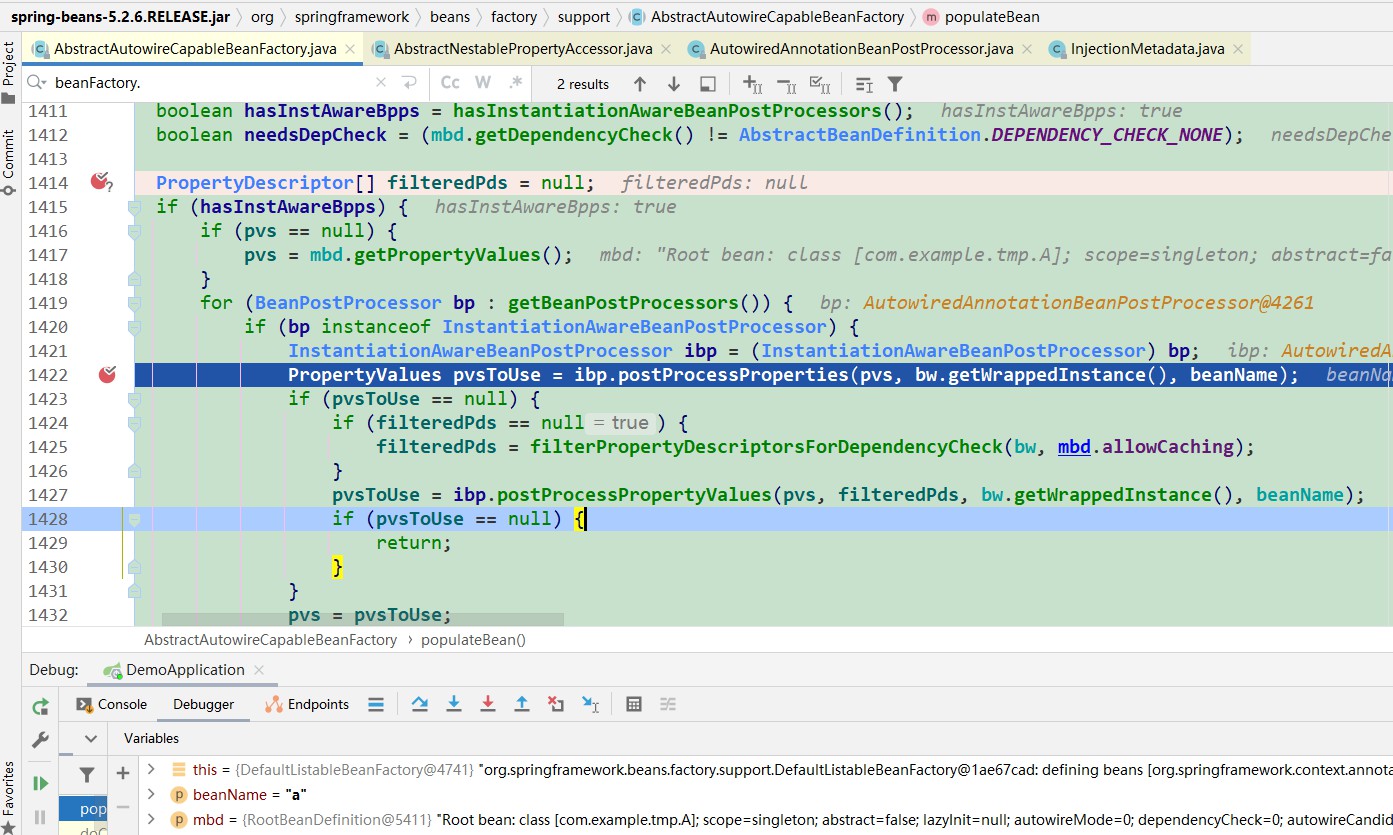 经过上边的定位,可以确定,核心代码在:AbstractAutowireCapableBeanFactory#populateBean(beanName, mbd, instanceWrapper);